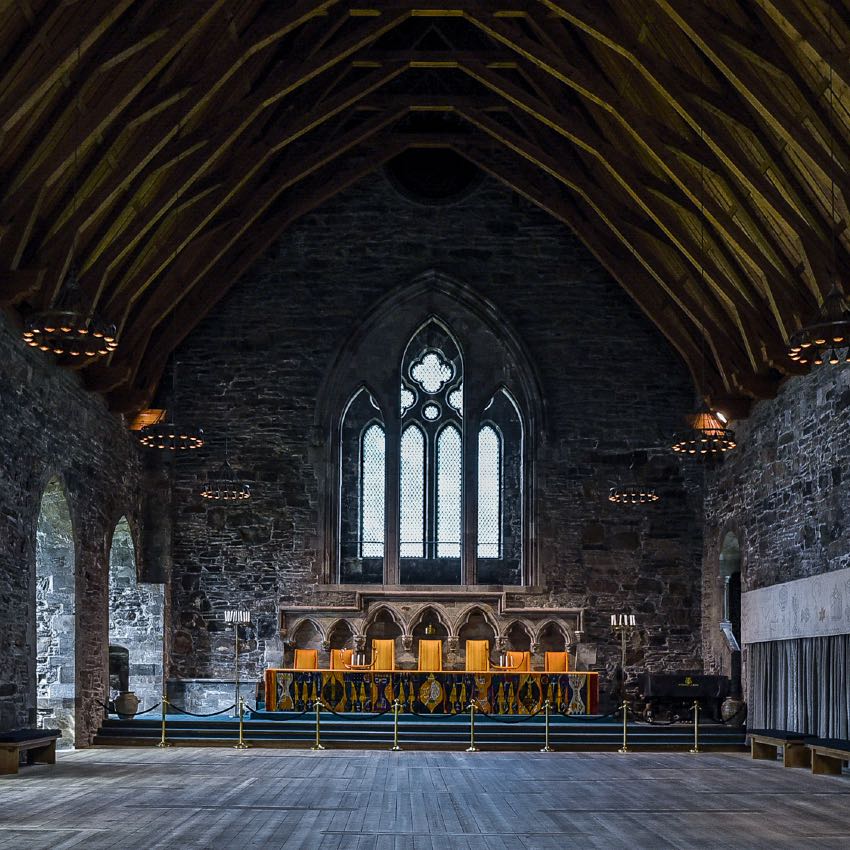 1266 wurde die Halle von einem großen Feuer stark zerstört. Danach begannen die Arbeiten an dem phantastischen Gewölbedach aus Stein, das als Feuerschutz zwischen den Stockwerken dienen sollte. Sieh dir dieses Dach in aller Ruhe an und genieße den Anblick dieser sehr schönen handwerklichen Arbeit.